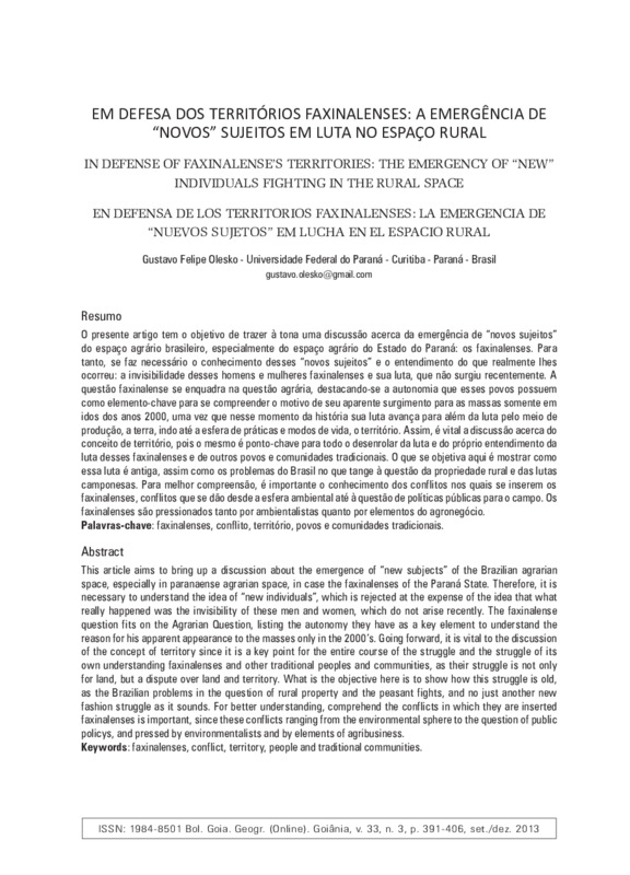 O presente artigo tem o objetivo de trazer à tona uma discussão acerca da emergência de “novos sujeitos”do espaço agrário brasileiro, especialmente do espaço agrário do Estado do Paraná: os faxinalenses. Paratanto, se faz necessário o conhecimento desses “novos sujeitos” e o entendimento do que realmente lhesocorreu: a invisibilidade desses homens e mulheres faxinalenses e sua luta, que não surgiu recentemente. Aquestão faxinalense se enquadra na questão agrária, destacando-se a autonomia que esses povos possuemcomo elemento-chave para se compreender o motivo de seu aparente surgimento para as massas somente emidos dos anos 2000, uma vez que nesse momento da história sua luta avança para além da luta pelo meio deprodução, a terra, indo até a esfera de práticas e modos de vida, o território. Assim, é vital a discussão acerca doconceito de território, pois o mesmo é ponto-chave para todo o desenrolar da luta e do próprio entendimento daluta desses faxinalenses e de outros povos e comunidades tradicionais. O que se objetiva aqui é mostrar comoessa luta é antiga, assim como os problemas do Brasil no que tange à questão da propriedade rural e das lutascamponesas. Para melhor compreensão, é importante o conhecimento dos conflitos nos quais se inserem osfaxinalenses, conflitos que se dão desde a esfera ambiental até à questão de políticas públicas para o campo. Osfaxinalenses são pressionados tanto por ambientalistas quanto por elementos do agronegócio.