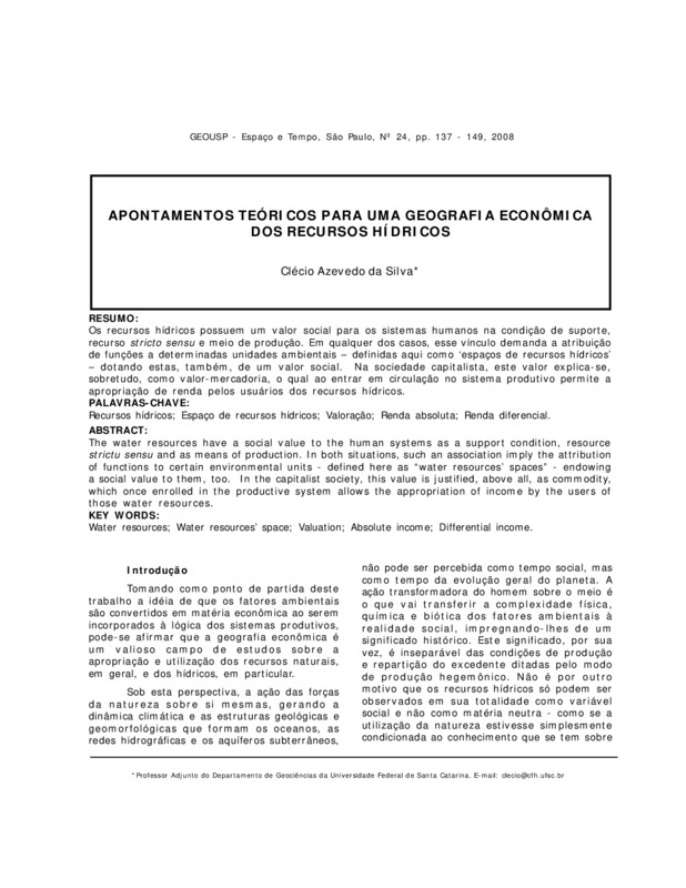 APONTAMENTOS TEÓRICOS PARA UMA GEOGRAFIA ECONÔMICA DOS RECURSOS HÍDRICOS