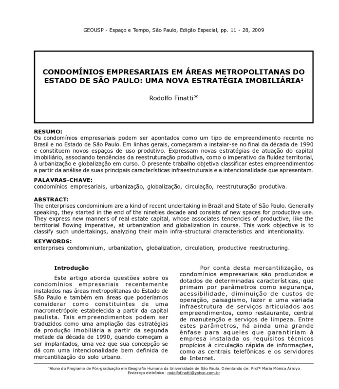 CONDOMÍNIOS EMPRESARIAIS EM ÁREAS METROPOLITANAS DO ESTADO DE SÃO PAULO: UMA NOVA ESTRATÉGIA IMOBILIÁRIA