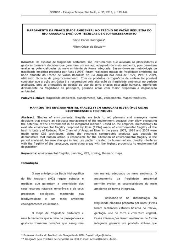 MAPEAMENTO DA FRAGILIDADE AMBIENTAL NO TRECHO DE VAZÃO REDUZIDA DO RIO ARAGUARI (MG) UTILIZANDO TÉCNICAS DE GEOPROCESSAMENTO