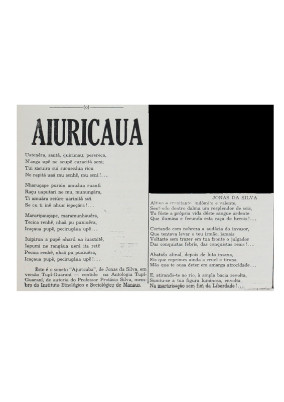 Aiuricaua. Versão tupi do soneto Ajuricaba, (que também é divulgado) da Antologia Tupi-Guarani do professor Protásio Silva (Manaus)