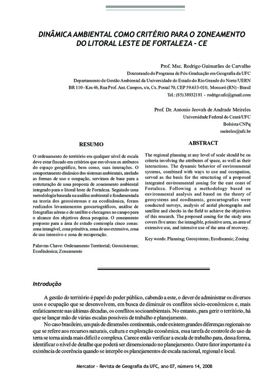 DINÂMICA AMBIENTAL COMO CRITÉRIO PARA O ZONEAMENTO DO LITORAL LESTE DE FORTALEZA - CE (environmental dynamic criteria for planning of east coast of Fortaleza – Ceará - northeast Brazil)