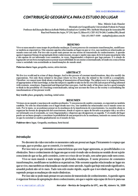 CONTRIBUIÇÃO GEOGRÁFICA PARA O ESTUDO DO LUGAR (a geographical contribution for the study of the place)