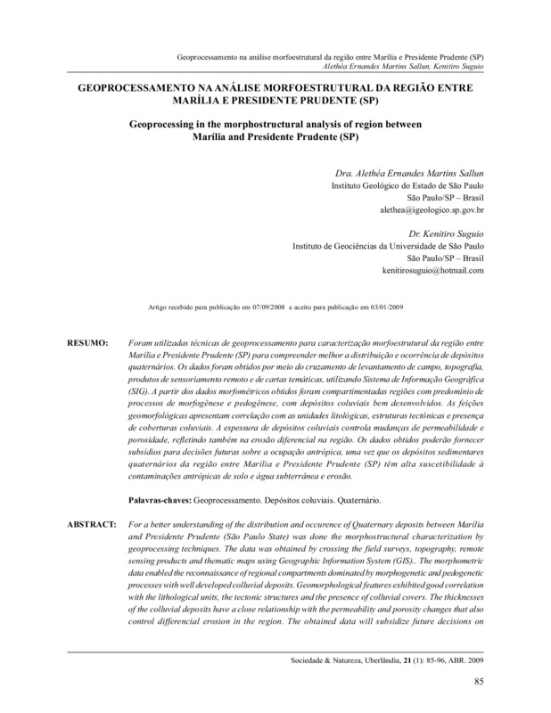 Foram utilizadas técnicas de geoprocessamento para caracterização morfoestrutural da região entre Marília e Presidente Prudente (SP) para compreender melhor a distribuição e ocorrência de depósitos quaternários, através de produtos de sensoriamento remoto e geração de cartas temáticas utilizando Sistema de Informação Geográfica (SIG). A partir dos dados morfométricos obtidos foram compartimentadas regiões com predomínio de processos de morfogênese e pedogênese, com depósitos coluviais bem desenvolvidos. As feições geomorfológicas apresentam correlação com as unidades litológicas, estruturas tectônicas e presença de coberturas coluviais. A espessura de depósitos coluviais controla mudanças de permeabilidade e porosidade, refletindo também na erosão diferencial na região.