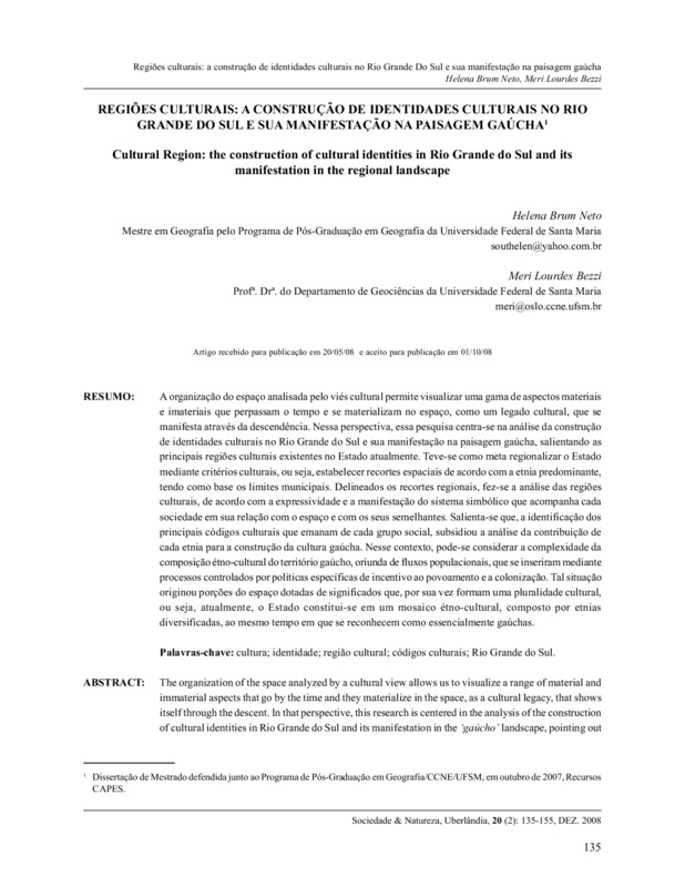 Regiões culturais: a construção de identidades culturais no Rio Grande do Sul e sua manifestação na paisagem gaúcha / Cultural Region: the construction of cultural identities in Rio Grande do Sul and its manifestation in the regional landscape