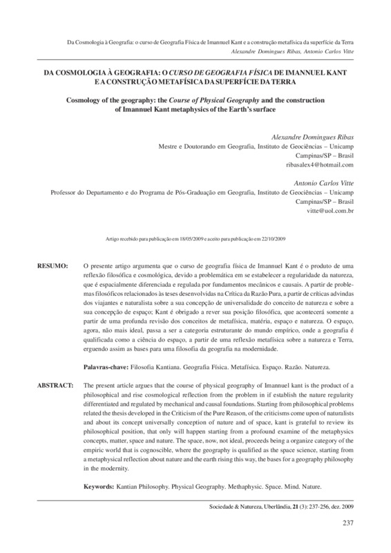 O presente artigo argumenta que o curso de geografia física de Imannuel Kant é o produto de uma reflexão filosófica e cosmológica, devido a problemática em se estabelecer a regularidade da natureza, que é espacialmente diferenciada e regulada por fundamentos mecânicos e causais. A partir de problemas filosóficos relacionados às teses desenvolvidas na Crítica da Razão Pura, a partir de críticas advindas dos viajantes e naturalista sobre a sua concepção de universalidade do conceito de natureza e sobre a sua concepção de espaço; Kant é obrigado a rever sua posição filosófica, que acontecerá somente a partir de uma profunda revisão dos conceitos de metafísica, matéria, espaço e natureza. O espaço, agora, não mais ideal, passa a ser a categoria estruturante do mundo empírico, onde a geografia é qualificada como a ciência do espaço, a partir de uma reflexão metafísica sobre a natureza e Terra, erguendo assim as bases para uma filosofia da geografia na modernidade.
