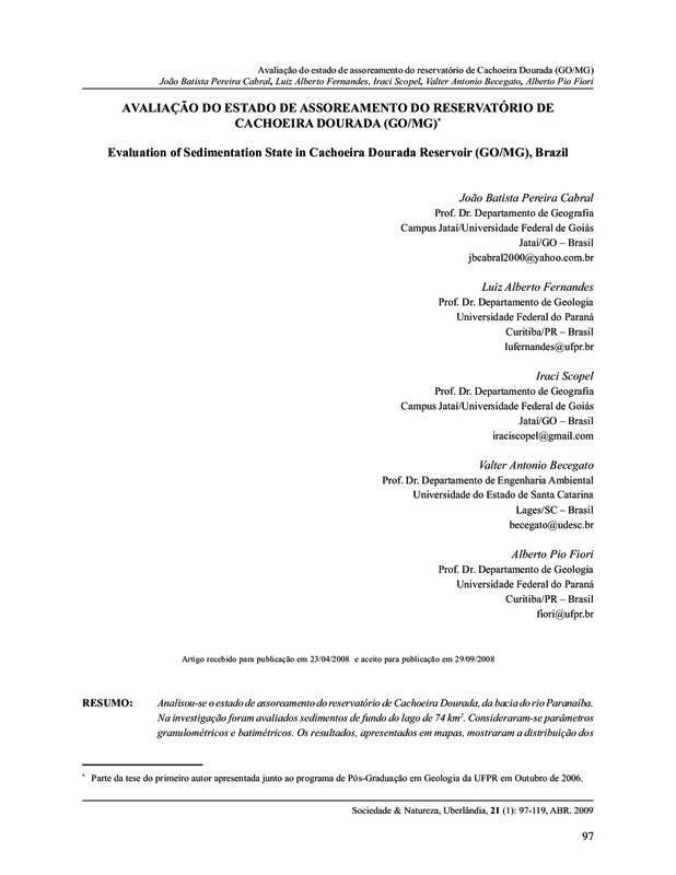 Analisou-se o estado de assoreamento do reservatório de Cachoeira Dourada, da bacia do rio Paranaíba.