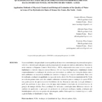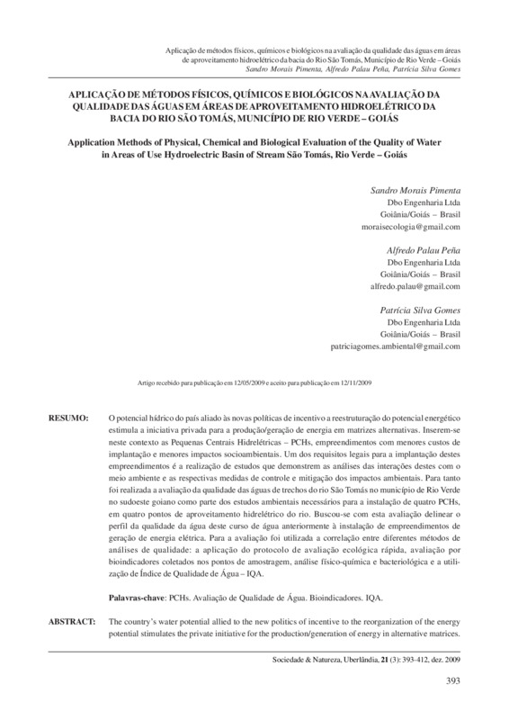 Aplicação de métodos físicos, químicos e biológicos na avaliação da qualidade das águas em áreas de aproveitamento hidroelétrico da bacia do Rio São Tomás, Município de Rio Verde – Goiás / Application methods of physical, chemical and biological evaluation of the quality of water in areas of use hydroelectric basin of Stream São Tomás, Rio Verde – Goiás