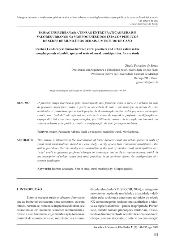 O presente artigo interessa-se pelo esmaecimento das fronteiras entre o rural e o urbano em sedes de pequenos municípios rurais. A partir de um estudo de caso – um município de menos de 3 mil habitantes –, postula-se neste artigo que a inadequação da denominação destas sedes pequenos municípios rurais como “cidade não seja inócua; esta seria capaz de engendrar profundas modificações no espaço distrital e em suas representações, possibilitando, através da inscrição no território de valores urbanos e de práticas rurais, a configuração de uma paisagem rurbana.