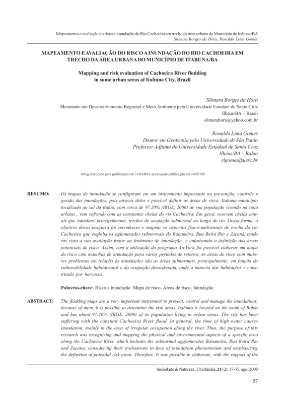 Mapeamento e avaliação do risco a inundação do Rio Cachoeira em trecho da área urbana do município de Itabuna/BA / Mapping and risk evaluation of Cachoeira River flodding in some urban areas of Itabuna City, Brazil