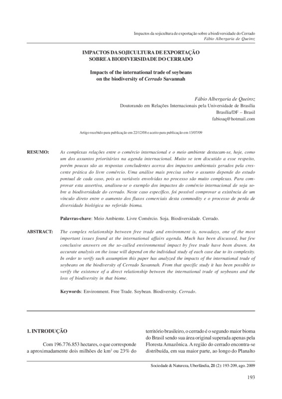 As complexas relações entre o comércio internacional e o meio ambiente destacam-se, hoje, como um dos assuntos prioritários na agenda internacional. Muito se tem discutido a esse respeito, porém poucas são as respostas concludentes acerca dos impactos ambientais gerados pela crescente prática do livre comércio. Uma análise mais precisa sobre o assunto depende do estudo pontual de cada caso, pois as variáveis envolvidas no processo são muito complexas. Para comprovar esta assertiva, analisou-se o exemplo dos impactos do comércio internacional de soja sobre a biodiversidade do cerrado. Neste caso específico, foi possível comprovar a existência de um vínculo direto entre o aumento dos fluxos comerciais desta commodity e o processo de perda de diversidade biológica no referido bioma.
