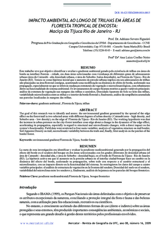 IMPACTO AMBIENTAL AO LONGO DE TRILHAS EM ÁREAS DE FLORESTA TROPICAL DE ENCOSTA: MACIÇO DA TIJUCA RIO DE JANEIRO – RJ (ambiental impact on trails of tropical forest on the atlantic slope: Tijuca’s massif- Rio de Raneiro- RJ)