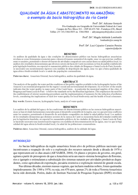 QUALIDADE DA ÁGUA E ABASTECIMENTO NA AMAZÔNIA: o exemplo da bacia hidrográfica do rio Caeté (water quality and public supply conditions in the amazon region: the example of the Caeté´s hydrographic river basin, eastern amazon, Brazil)