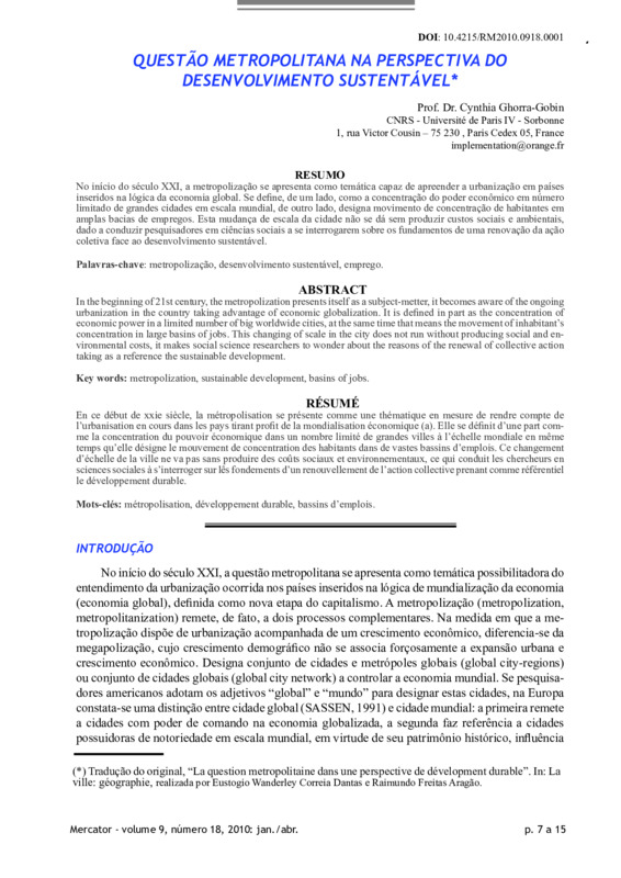 QUESTÃO METROPOLITANA NA PERSPECTIVA DO DESENVOLVIMENTO SUSTENTÁVEL (metropolization and sustainability)