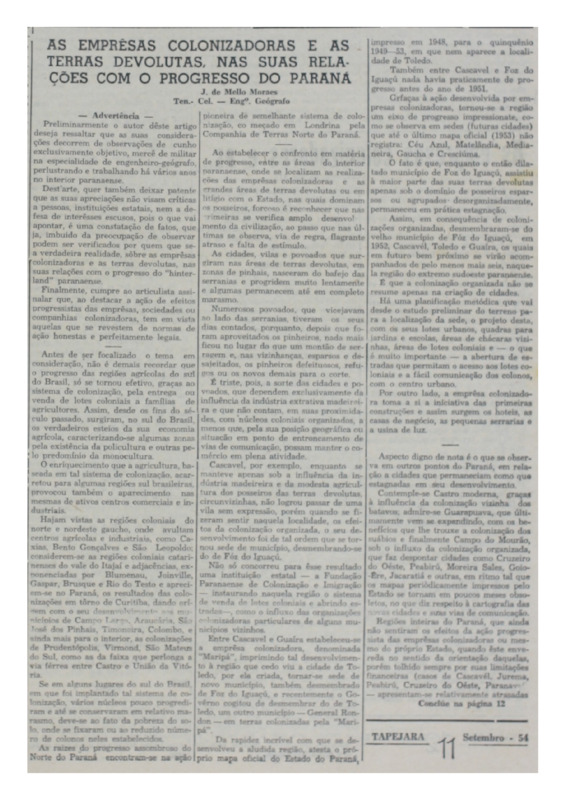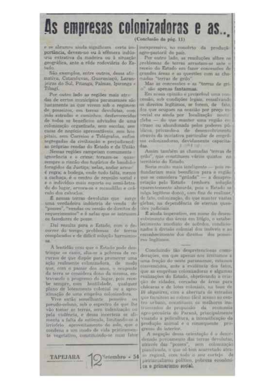 - As empresas colonizadoras e as terras devolutas, nas suas relações com o progresso do Paraná. Defesa da ocupação planificada das terras