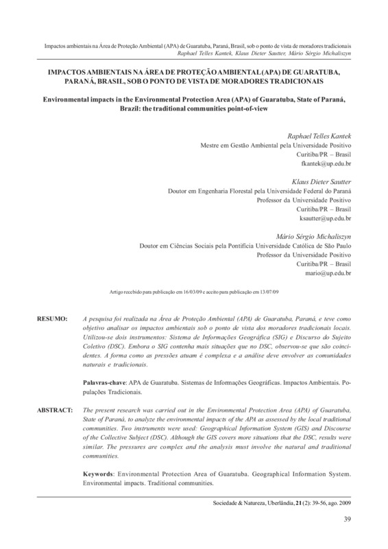 A pesquisa foi realizada na rea de Proteção Ambiental (APA) de Guaratuba, Paraná, e teve como objetivo analisar os impactos ambientais sob o ponto de vista dos moradores tradicionais locais. Utilizou-se dois instrumentos: Sistema de Informações Geográfica (SIG) e Discurso do Sujeito Coletivo (DSC). Embora o SIG contenha mais situações que no DSC, observou-se que são coincidentes. A forma como as pressões atuam é complexa e a análise deve envolver as comunidades naturais e tradicionais.