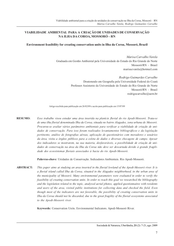 Esse trabalho visou estudar uma área inserida na planície fluvial do rio Apodi-Mossoró. Trata-se de uma ilha fluvial denominada Ilha da Coroa, situada no bairro alagados, zona urbana de Mossoró. Procurou-se avaliar vários parâmetros ambientais para verificar a viabilidade de criação de unidades de conservação. Para isso foram realizados levantamentos bibliográficos e da legislação pertinente, análise de fotografias aéreas, aplicação de questionários com moradores e usuários da área, visita a órgãos públicos para a coleta de dados e diversas checagens de campo. Apesar dos indicadores se mostrarem, na sua maioria, desfavoráveis, a possibilidade de criação de unidades de conservação na área da Ilha da Coroa não deve ser descartada devido à grande fragilidade dos ecossistemas fluviais associados à bacia do rio Apodi/Mossoró.