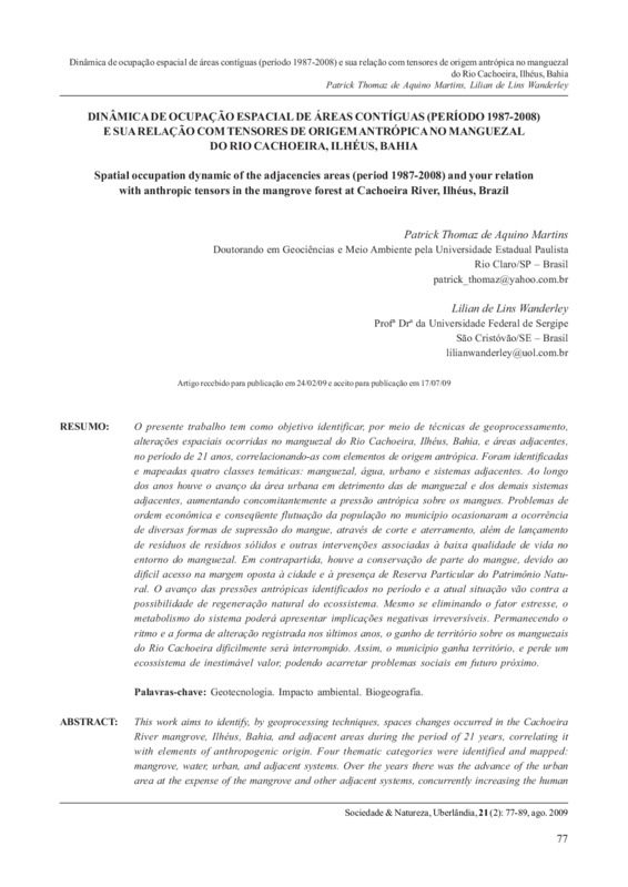 Dinâmica de ocupação espacial de áreas contíguas (Período 1987-2008) e sua relação com tensores de origem antrópica no manguezal do Rio Cachoeira, Ilhéus, Bahia / Spatial occupation dynamic of the adjacencies areas (period 1987-2008) and your relation with anthropic tensors in the mangrove forest at Cachoeira River, Ilhéus, Brazil