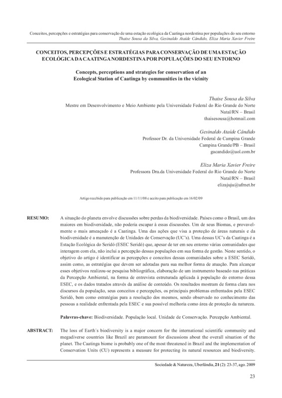 Conceitos, percepções e estratégias para conservação de uma Estação Ecológica da Caatinga nordestina por populações do seu entorno / Concepts, perceptions and strategies for conservation of an Ecological Station of Caatinga by communities in the vicinity
