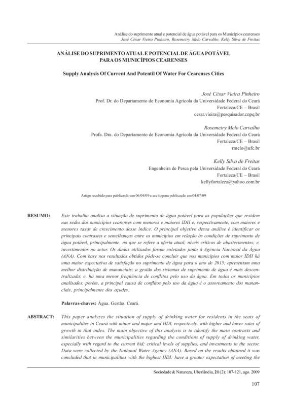 Análise do suprimento atual e potencial de água potável para os municípios cearenses / Supply analysis of current and potentil of water for cearenses cities