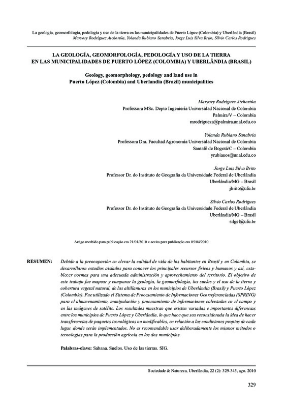La Geología, Geomorfología, Suelos y Uso de la Tierra en Puerto López, Colombia y Uberlândia Brasil. / Geology, geomorphology, pedology and land use in Puerto López (Colombia) and Uberlandia (Brazil) municipalities