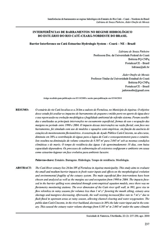 Interferências de barramentos no regime hidrológico do Estuário do Rio Catú – Ceará – Nordeste do Brasil / Barrier Interference on Catú Estuarine Hydrologic System – Ceará – NE – Brazil