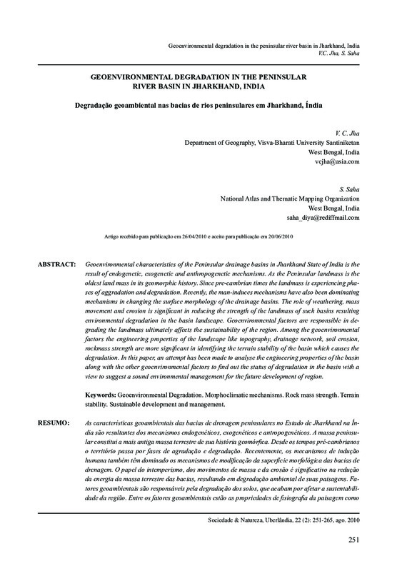 Geoenvironmental degradation in the peninsular river basin in Jharkhand, India / Degradação geoambiental nas bacias de rios peninsulares em Jharkhand, Índia