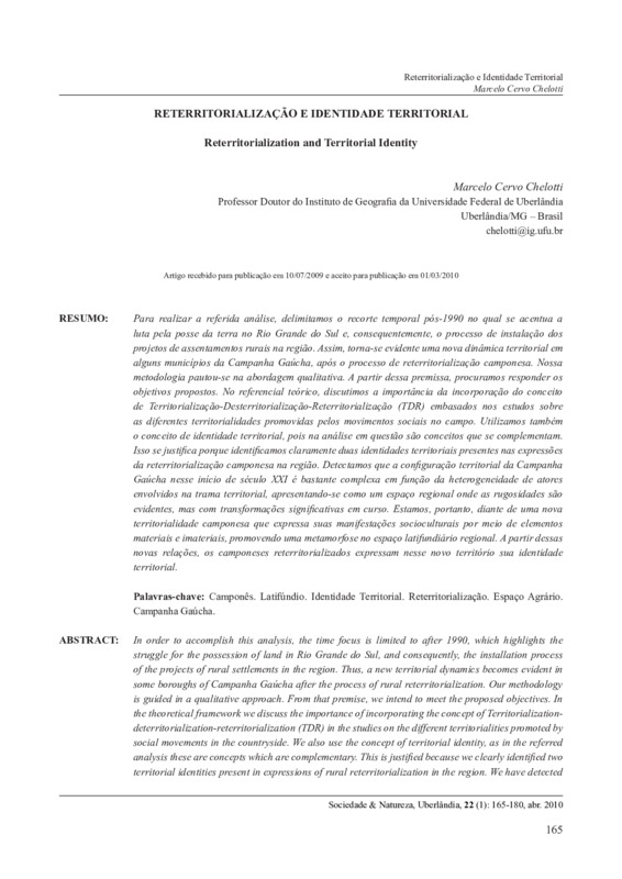 Para realizar a referida análise, delimitamos o recorte temporal pós-1990 no qual se acentua a luta pela posse da terra no Rio Grande do Sul e, consequentemente, o processo de instalação dos projetos de assentamentos rurais na região. Assim, torna-se evidente uma nova dinâmica territorial em alguns municípios da Campanha Gaúcha, após o processo de reterritorialização camponesa. Nossa metodologia pautou-se na abordagem qualitativa. A partir dessa premissa, procuramos responder os objetivos propostos. No referencial teórico, discutimos a importância da incorporação do conceito de Territorialização-Desterritorialização-Reterritorialização (TDR) embasados nos estudos sobre as diferentes territorialidades promovidas pelos movimentos sociais no campo. Utilizamos também o conceito de identidade territorial, pois na análise em questão são conceitos que se complementam. Isso se justifica porque identificamos claramente duas identidades territoriais presentes nas expressões da reterritorialização camponesa na região. Detectamos que a configuração territorial da Campanha Gaúcha nesse início de século XXI é bastante complexa em função da heterogeneidade de atores envolvidos na trama territorial, apresentando-se como um espaço regional onde as rugosidades são evidentes, mas com transformações significativas em curso. Estamos, portanto, diante de uma nova territorialidade camponesa que expressa suas manifestações socioculturais por meio de elementos materiais e imateriais, promovendo uma metamorfose no espaço latifundiário regional. A partir dessas novas relações, os camponeses reterritorializados expressam nesse novo território sua identidade territorial.