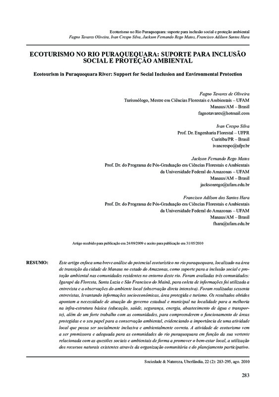 Ecoturismo no Rio Puraquequara: suporte para inclusão social e proteção ambiental / Ecotourism in Puraquequara River: Support for Social Inclusion and Environmental Protection