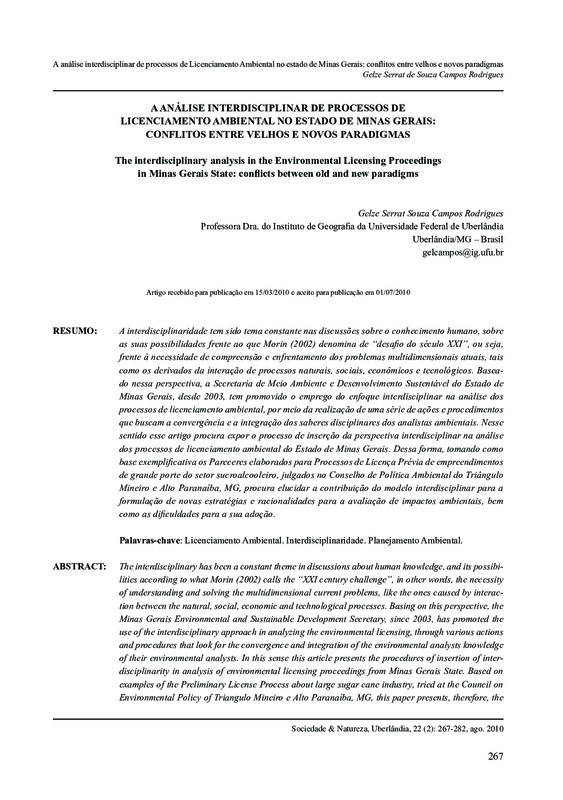 A análise interdisciplinar de processos de Licenciamento Ambiental no estado de Minas Gerais: conflitos entre velhos e novos paradigmas / The interdisciplinary analysis in the Environmental Licensing Proceedings in Minas Gerais State: conflicts between old and new paradigms