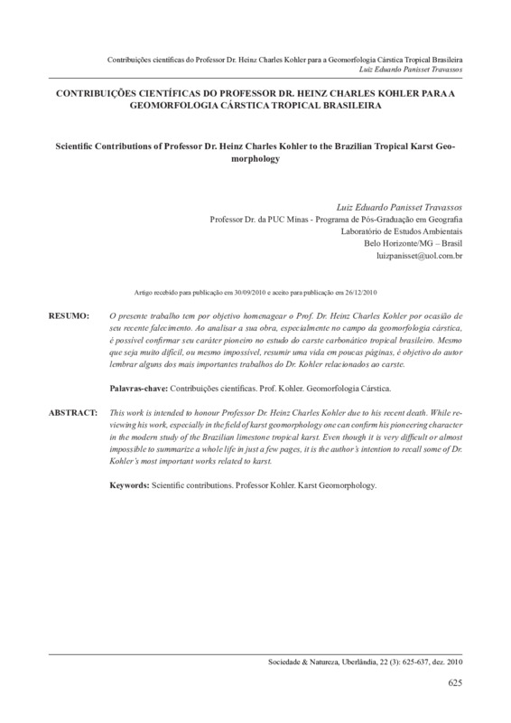 Contribuições científicas do Professor Dr. Heinz Charles Kohler para a Geomorfologia Cárstica Tropical Brasileira / Scientific Contributions of Professor Dr. Heinz Charles Kohler to the Brazilian Tropical Karst Geomorphology