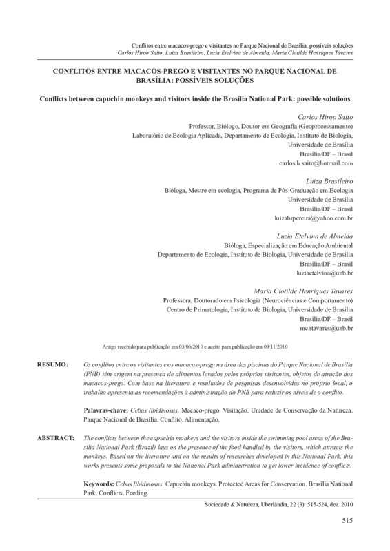 Os conflitos entre os visitantes e os macacos-prego na área das piscinas do Parque Nacional de Brasília (PNB) têm origem na presença de alimentos levados pelos próprios visitantes, objetos de atração dos macacos-prego. Com base na literatura e resultados de pesquisas desenvolvidas no próprio local, o trabalho apresenta as recomendações à administração do PNB para reduzir os níveis de o conflito.