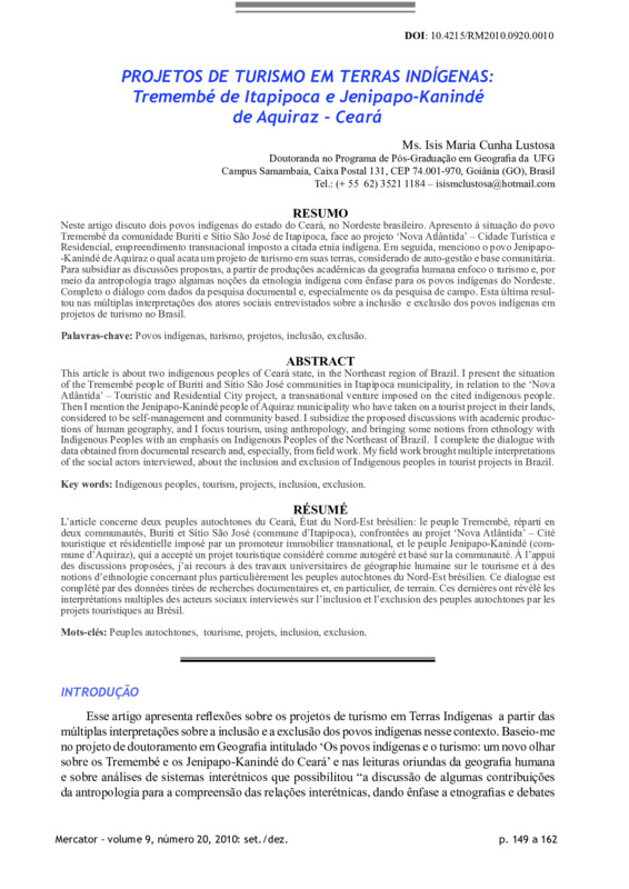 PROJETOS DE TURISMO EM TERRAS INDÍGENAS: Tremembé de Itapipoca e Jenipapo-Kanindé de Aquiraz - Ceará (tourist projects in indigenous lands: the Tremembé people of Itapipoca and the Jenipapo-Kanindé people of Aquiraz in Ceará state, Brazil)