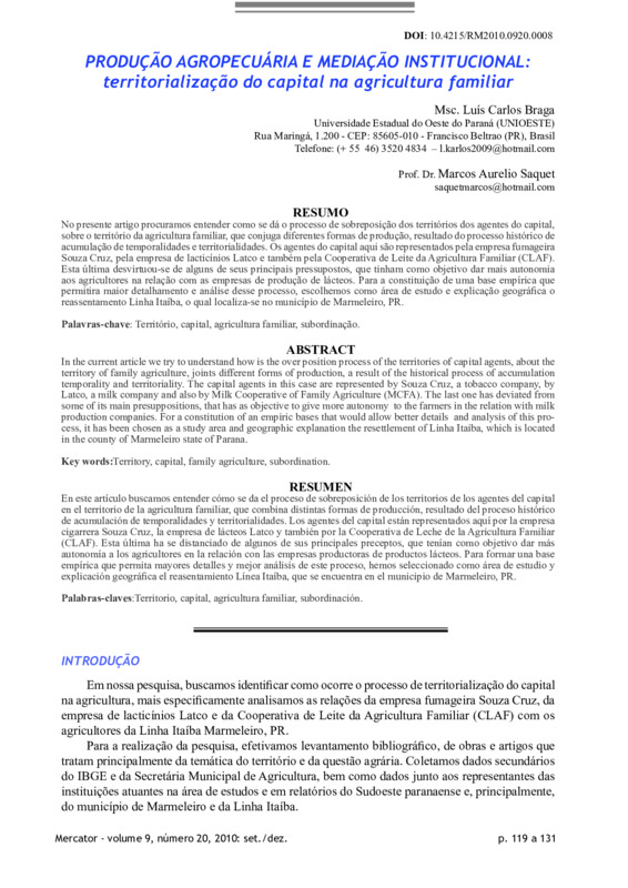 PRODUÇÃO AGROPECUÁRIA E MEDIAÇÃO INSTITUCIONAL: territorialização do capital na agricultura familiar (agribusiness production and institutional mediation: the territorialization of capital in the family agriculture)