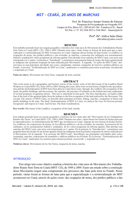 Sem Terra no Ceará (MST- CE), 1989 a 2009. Durante esses anos, várias foram as formas de lutas para que a espa-