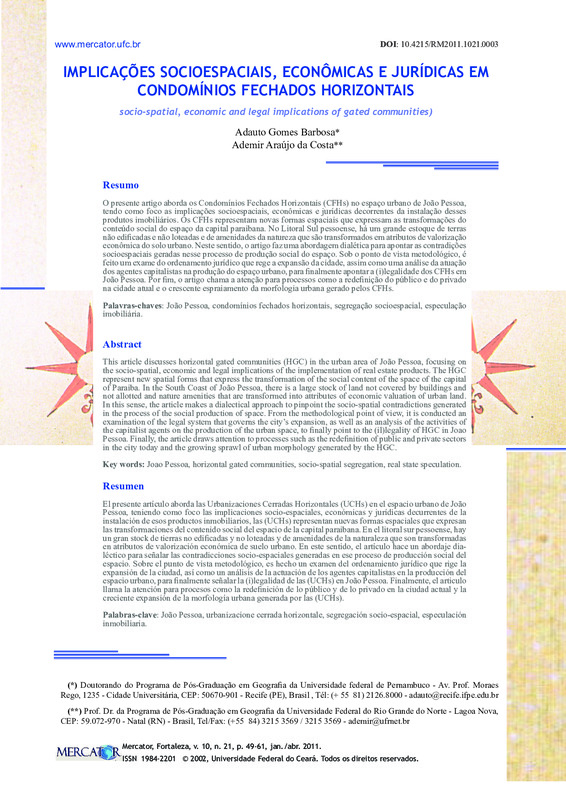 IMPLICAÇÕES SOCIOESPACIAIS, ECONÔMICAS E JURÍDICAS DOS CONDOMÍNIOS FECHADOS HORIZONTAIS (socio-spatial, economic and legal implications of gated communities)