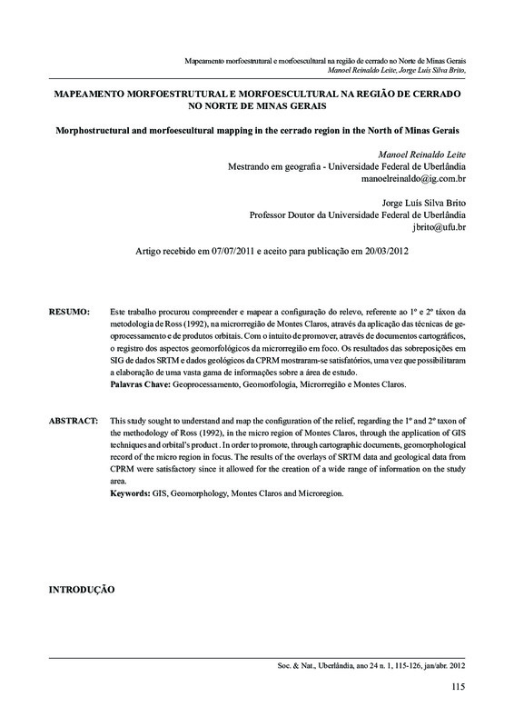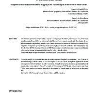 Resumo: este trabalho procurou compreender e mapear a configuração do relevo, referente ao 1º e 2º táxon da metodologia de Ross (1992), na microrregião de Montes Claros, através da aplicação das técnicas de geoprocessamento, de produtos orbitais e de informações colaterais, no intuito de promover, através de documentos cartográficos, o registro dos aspectos morfoestruturais e morfoesculturais referentes à morfologia desta microrregião. Estes objetivos se justificam uma vez que as unidades mapeadas fornecem informações fundamentais para a interpretação dos fenômenos geomorfológicos da área de estudo, contribuindo desta forma, para a analise destes terrenos a partir de levantamentos confiáveis de dados georreferenciados, possibilitando, assim, a espacialização e localização das feições geomorfológicas da presente microrregião. Os resultados das sobreposições em SIG de dados SRTM e dados geológicos da CPRM mostraram-se satisfatórios uma vez que possibilitaram a elaboração de uma vasta gama de informações sobre a área de estudo