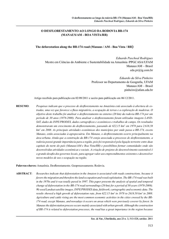 Pesquisas indicam que o processo de desflorestamento na Amazônia está associado à abertura de estradas, uma vez que favorece o fluxo migratório, a ocupação de terras e a exploração de madeiras. O objetivo deste trabalho foi analisar o desflorestamento no entorno (20 km) da rodovia BR-174 para um período de 30 anos (1978-2008). Foram utilizadas imagens LANDSAT, dados do INPE/PRODES, dados cartográficos e econômicos e trabalhos de campo. Os resultados demonstraram um crescimento do desflorestamento, passando de 622,15 km2 em 1978 para 2.618,58 km2 em 2008. As principais atividades econômicas dos municípios por onde passa a BR-174, exceto Manaus, estão associadas à agropecuária. Em Manaus, o desflorestamento ocorre principalmente na área urbana. Ainda que a construção da BR-174 esteja associada a processos de desflorestamento, a rodovia possui grande importância para a região, pois foi responsável pela ligação terrestre entre duas capitais do norte do país (Manaus/AM e Boa Vista/RR) e possibilitou formar comunidades onde são desenvolvidas atividades econômicas e sociais. A criação de projetos de desenvolvimento sustentável é o grande desafio dos governos locais, para agregar valor aos empreendimentos existentes e desenvolver novos modelos de uso e ocupação na região.