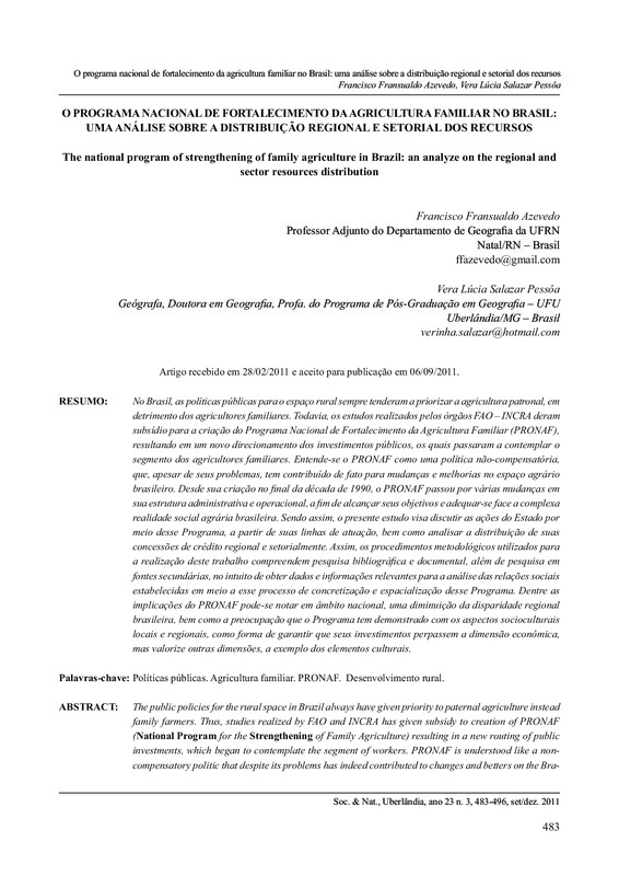 O programa nacional de fortalecimento da agricultura familiar no Brasil: uma análise sobre a distribuição regional e setorial dos recursos / The national program of strengthening of family agriculture in Brazil: an analyze on the regional and sector....