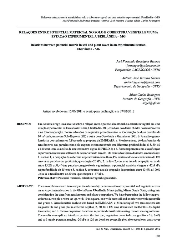 Faz-se neste artigo uma análise sobre a relação entre o potencial matricial e a cobertura vegetal em uma estação experimental na Fazenda do Glória, Uberlândia- MG, com base nos dados obtidos nos tensiômetros e na fotocomparação. Foram adotados os seguintes procedimentos: a. Construção de duas parcelas de 10 m2 cada, uma com Solo Exposto (SE) e outra com Geotêxteis e Gramíneas (SG); b. A análise granulométrica dos sedimentos foi baseada na proposta da EMBRAPA; c. Monitoramento de duas baterias de tensiômetros nas parcelas com solo exposto e com geotêxteis em diferentes profundidades (15, 30, 80 e 120 cm), com o auxílio de um tensímetro digital INFIELD 5; e d. Fotocomparação com classificação supervisionada usando software de sensoriamento remoto. Os resultados foram divididos em três fases: 1. na fase 1, a ocupação da cobertura vegetal variou entre 0 a 6,4%, destacando-se o tensiômetro de 120 cm cm na parcela com geotêxteis, que atingiu -20 kPa; 2. na fase 2, com uma taxa de ocupação variando entre 15,2% a 59,4 % na parcela com geotêxteis e gramíneas, o potencial matricial chegou a -32,4 kPa na profundidade de 15 cm; e 3. na fase 3, com uma taxa de ocupação da gramínea entre 63,9% a 100% , cita-se o tensiômetro de 30 cm, que chegou a -67 kPa.