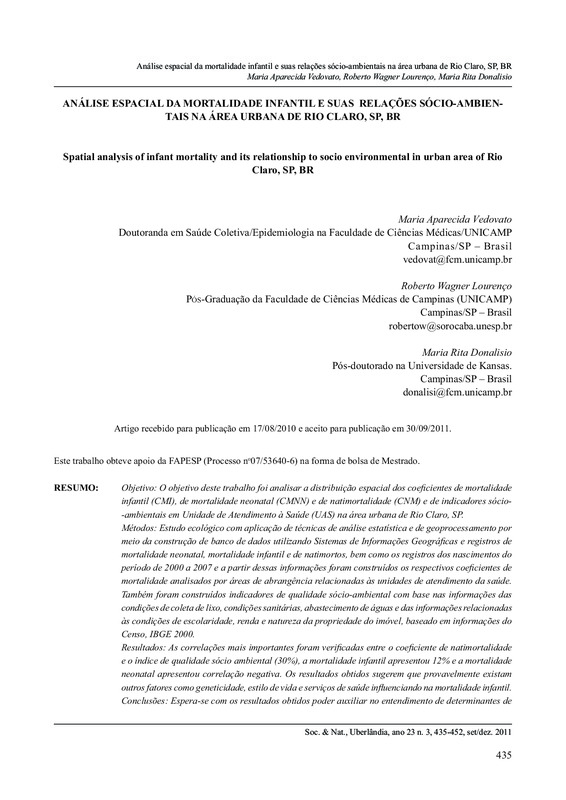 Análise espacial da Mortalidade Infantil e suas a relações sócio-ambientais em área urbana / Spatial analysis of infant mortality and its relationship to socio environmental in urban area of Rio Claro, SP, BR
