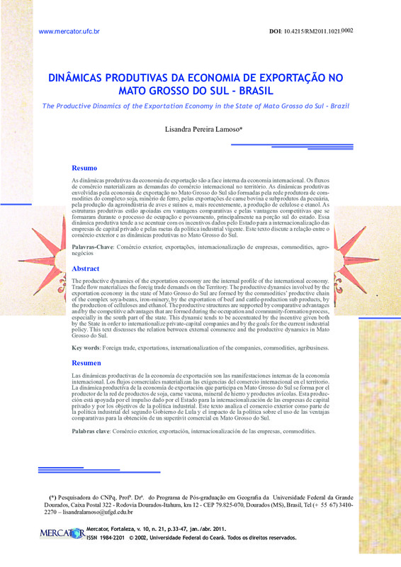 DINÂMICAS PRODUTIVAS DA ECONOMIA DE EXPORTAÇÃO NO MATO GROSSO DO SUL - BRASIL (the productive dinamics of the exportation economy in the state of Mato Grosso do Sul - Brasil)
