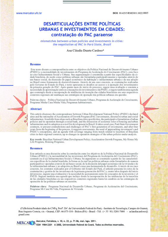 DESARTICULAÇÕES ENTRE POLÍTICAS URBANAS E INVESTIMENTOS EM CIDADES: contratação do PAC paraense (mismatches between urban policies and investments in cities: the negotiation of PAC in Pará State, Brazil)