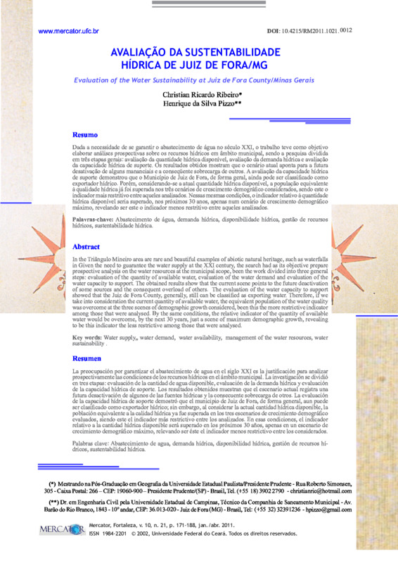 AVALIAÇÃO DA SUSTENTABILIDADE HÍDRICA DE JUIZ DE FORA/MG (evaluation of the water sustainability at Juiz de Fora county/Minas Gerais)