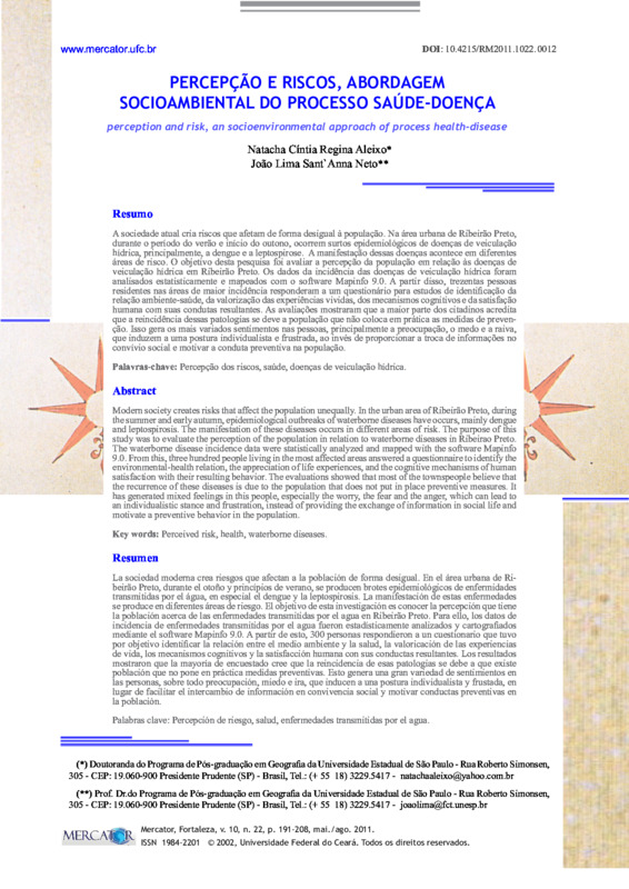 A sociedade atual cria riscos que afetam de forma desigual à população. Na área urbana de Ribeirão Preto, durante o período do verão e início do outono, ocorrem surtos epidemiológicos de doenças de veiculação hídrica, principalmente, a dengue e a leptospirose.  A manifestação dessas doenças acontece em diferentes áreas de risco. O objetivo desta pesquisa foi avaliar a percepção da população em relação às doenças de veiculação hídrica em Ribeirão Preto. Os dados da incidência das doenças de veiculação hídrica foram analisados estatisticamente e mapeados com o software Mapinfo 9.0. A partir disso, trezentas pessoas residentes nas áreas de maior incidência responderam a um questionário para estudos de identificação da relação ambiente-saúde, da valorização das experiências vividas, dos mecanismos cognitivos e da satisfação humana com suas condutas resultantes. As avaliações mostraram que a maior parte dos citadinos acredita que a reincidência dessas patologias se deve a população que não coloca em prática as medidas de prevenção. Isso gera os mais variados sentimentos nas pessoas, principalmente a preocupação, o medo e a raiva, que induzem a uma postura individualista e frustrada, ao invés de proporcionar a troca de informações no convívio social e motivar a conduta preventiva na população.