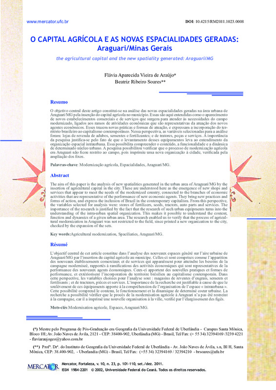 Araguari/MG pela inserção do capital agrícola no município. Essas são aqui entendidas como o aparecimento