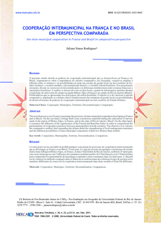 COOPERAÇÃO INTERMUNICIPAL NA FRANÇA E NO BRASIL EM PERSPECTIVA COMPARADA (the inter-municipal cooperation in France and Brazil in comparative perspective)