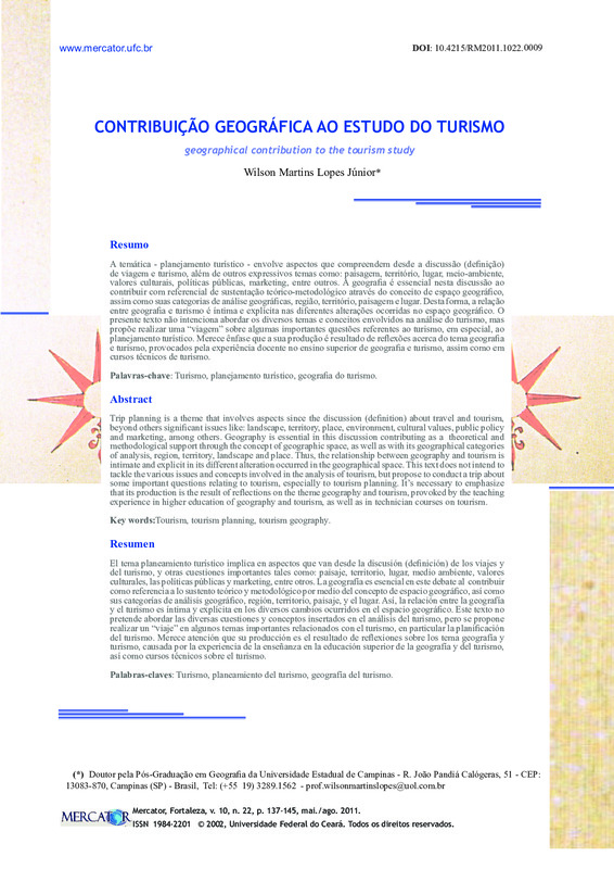 planejamento turístico. Merece ênfase que a sua produção é resultado de refl exões acerca do tema geografi a