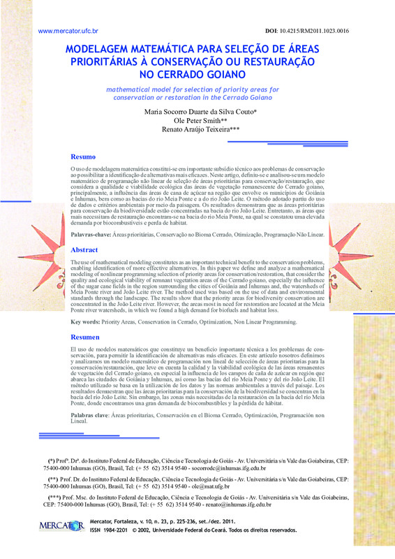 MODELAGEM MATEMÁTICA PARA SELEÇÃO DE ÁREAS PRIORITÁRIAS À CONSERVAÇÃO OU RESTAURAÇÃO NO CERRADO GOIANO (mathematical model for selection of priority areas for conservation or restoration in the Cerrado Goiano)