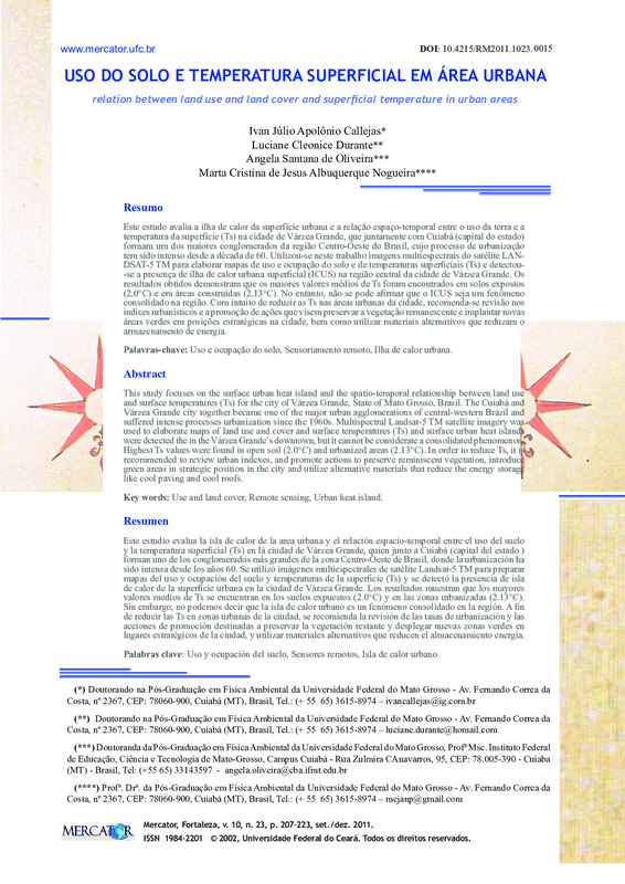 -se a presença de ilha de calor urbana superfi cial (ICUS) na região central da cidade de Várzea Grande. Os